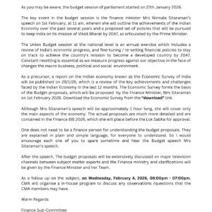 CMA’s Union Budget, 2026 Discussion https://www.cmakolkata.in/wp-content/uploads/2026/01/Economic-Survey-2025-26.pdf 04 Feb 6:00 pm - 7:00 pm Online Zoom